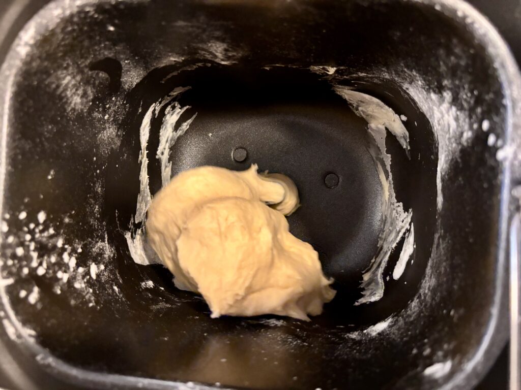 材料(強力粉・砂糖・塩・スキムミルク・無塩バター・卵・水)を全部ホームベーカリーに入れて「こね機能」で15分~18分ほど捏ねます。