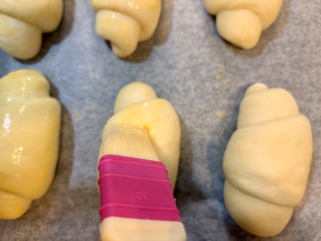 ロールパンに塗り卵を塗った後、オーブンを180℃で予熱し、完了後に約10-11分で焼きます。