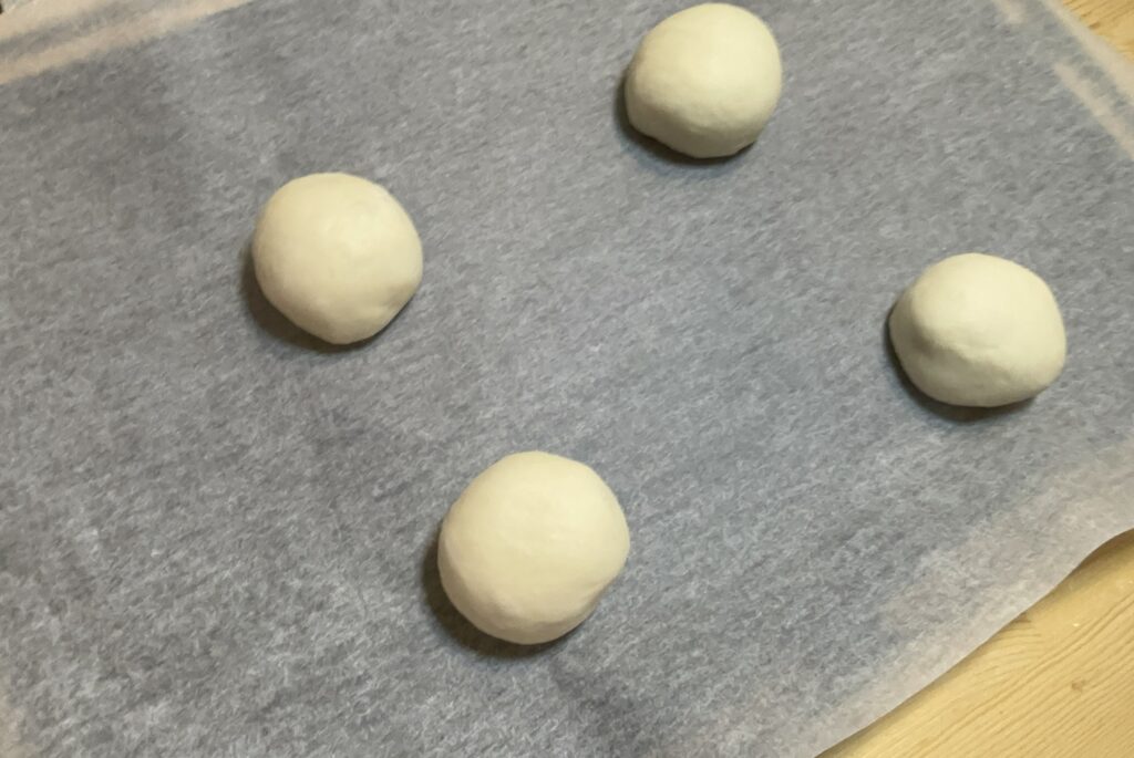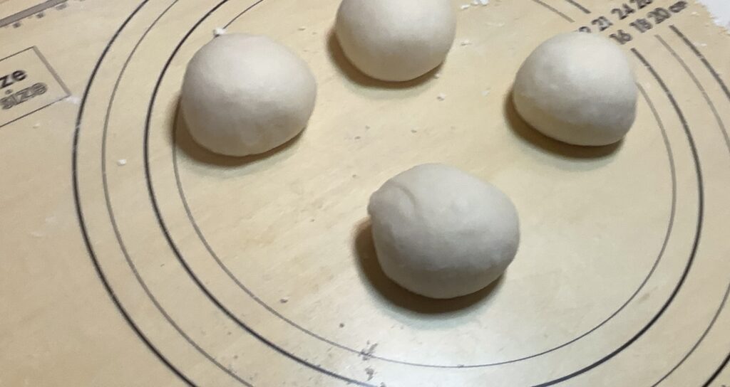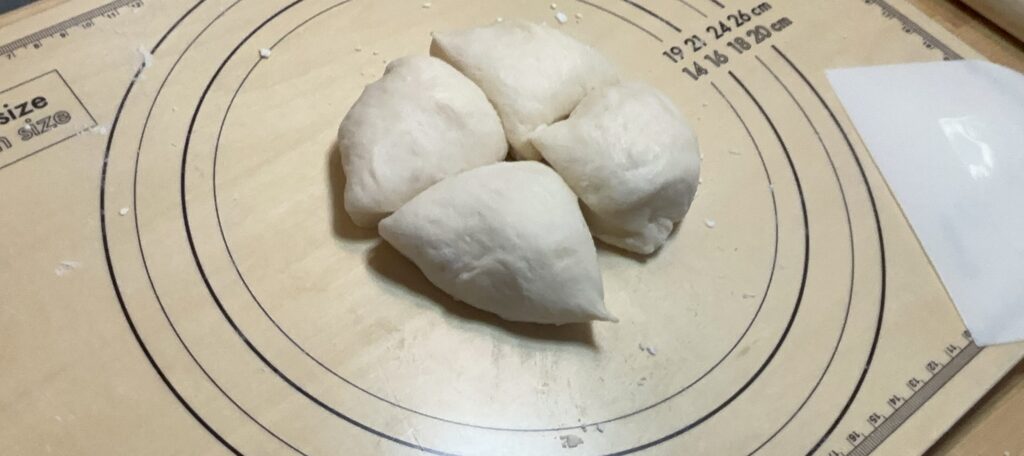 生地を4分割で丸型に成型。ラップを被せて10~15分ほどベンチタイムを取ります。