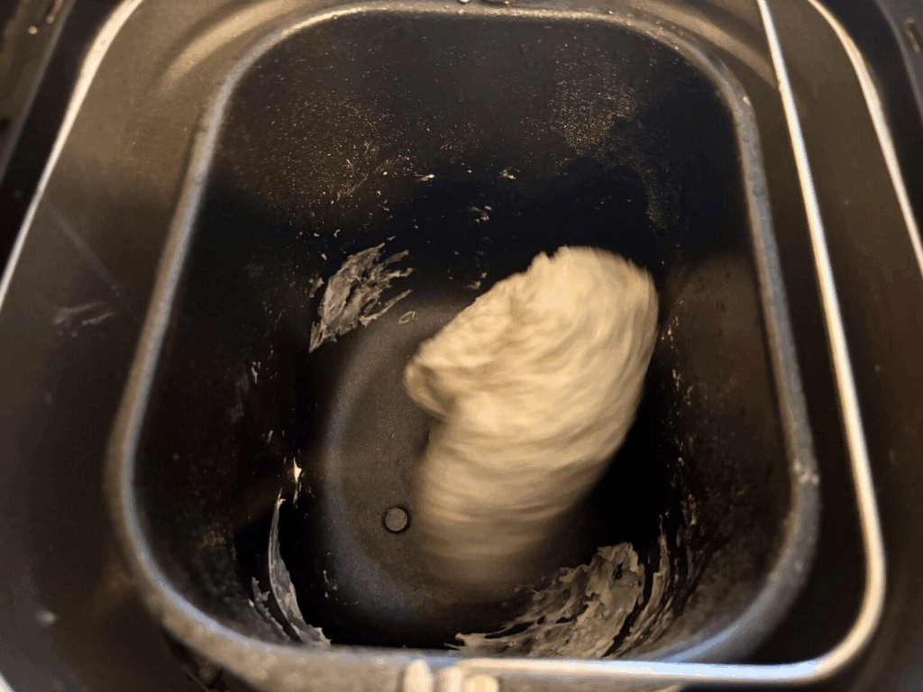 材料(強力粉・砂糖・塩・スキムミルク・無塩バター・水)を全部ホームベーカリーに入れて「こね機能」で15分~18分ほど捏ねます。